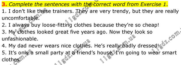 3. Complete the sentences with the correct word from Exercise 1. 1. I don’t like these trainers. They are very trendy, but they are really uncomfortable. 2. I always buy loose–fitting clothes because they’re so cheap! 3. My clothes looked great five years ago. Now they look so unfashionable. 4. My dad never wears nice clothes. He’s really badly dressed! 5. It’s only a small party at a friend’s house. I’m going to wear smart clothes.