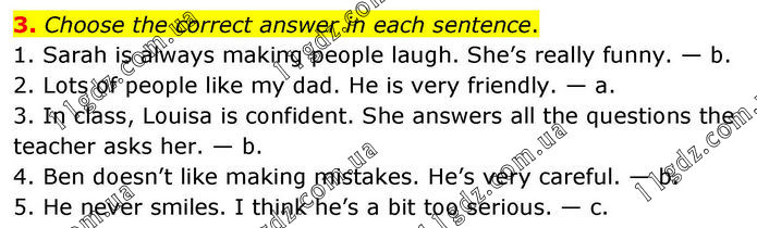 3. Choose the correct answer in each sentence. 1. Sarah is always making people laugh. She’s really funny. — b. 2. Lots of people like my dad. He is very friendly. — a. 3. In class, Louisa is confident. She answers all the questions the teacher asks her. — b. 4. Ben doesn’t like making mistakes. He’s very careful. — b. 5. He never smiles. I think he’s a bit too serious. — c.