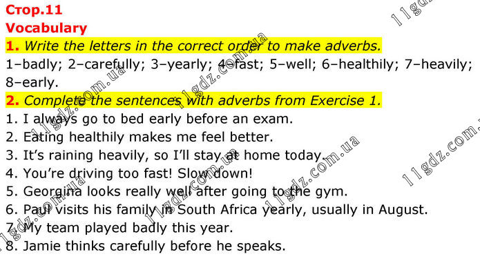 Vocabulary 1. Write the letters in the correct order to make adverbs. 1–badly; 2–carefully; 3–yearly; 4–fast; 5–well; 6–healthily; 7–heavily; 8–early. 2. Complete the sentences with adverbs from Exercise 1. 1. I always go to bed early before an exam. 2. Eating healthily makes me feel better. 3. It’s raining heavily, so I’ll stay at home today. 4. You’re driving too fast! Slow down! 5. Georgina looks really well after going to the gym. 6. Paul visits his family in South Africa yearly, usually in August. 7. My team played badly this year. 8. Jamie thinks carefully before he speaks.
