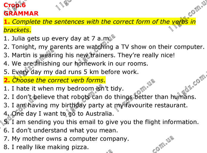 Стор.6 GRAMMAR 1. Complete the sentences with the correct form of the verbs in brackets. 1. Julia gets up every day at 7 a.m. 2. Tonight, my parents are watching a TV show on their computer. 3. Martin is wearing his new trainers. They’re really nice! 4. We are finishing our homework in our rooms. 5. Every day my dad runs 5 km before work. 2. Choose the correct verb forms. 1. I hate it when my bedroom isn’t tidy. 2. I don’t believe that robots can do things better than humans. 3. I am having my birthday party at my favourite restaurant. 4. One day I want to go to Australia. 5. I am sending you this email to give you the flight information. 6. I don’t understand what you mean. 7. My mother owns a computer company. 8. I really like making pizza.
