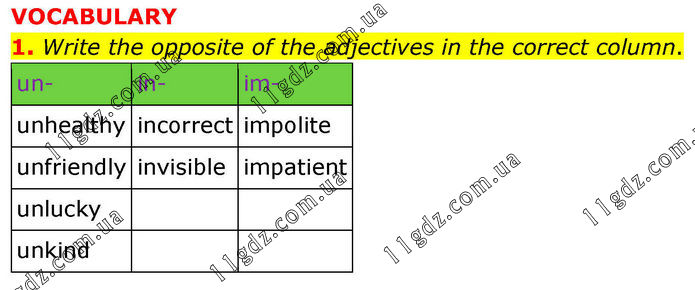 VOCABULARY 1. Write the opposite of the adjectives in the correct column. un– in– im– unhealthy incorrect impolite unfriendly invisible impatient unlucky unkind