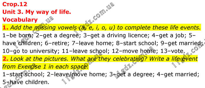 Unit 3. My way of life. Vocabulary 1. Add the missing vowels (a, e, i, o, u) to complete these life events. 1–be born; 2–get a degree; 3–get a driving licence; 4–get a job; 5–have children; 6–retire; 7–leave home; 8–start school; 9–get married; 10–go to university; 11–leave school; 12–move home; 13–vote. 2. Look at the pictures. What are they celebrating? Write a life event from Exercise 1 in each space. 1–start school; 2–leave/move home; 3–get a degree; 4–get married; 5–have children.