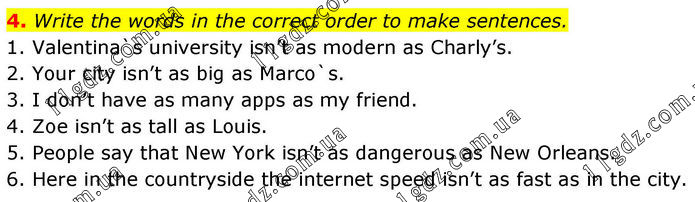 4. Write the words in the correct order to make sentences. 1. Valentina`s university isn’t as modern as Charly’s. 2. Your city isn’t as big as Marco`s. 3. I don’t have as many apps as my friend. 4. Zoe isn’t as tall as Louis. 5. People say that New York isn’t as dangerous as New Orleans. 6. Here in the countryside the internet speed isn’t as fast as in the city.