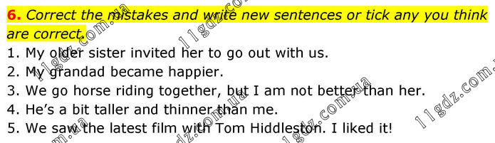 6. Correct the mistakes and write new sentences or tick any you think are correct. 1. My older sister invited her to go out with us. 2. My grandad became happier. 3. We go horse riding together, but I am not better than her. 4. He’s a bit taller and thinner than me. 5. We saw the latest film with Tom Hiddleston. I liked it!