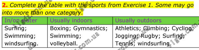 2. Complete the table with the sports from Exercise 1. Some may go into more than one category. In/on water Usually indoors Usually outdoors Surfing; Swimming; windsurfing. Boxing; Gymnastics; Swimming; volleyball. Athletics; Climbing; Cycling; Jogging; Rugby; Surfing; Tennis; windsurfing.