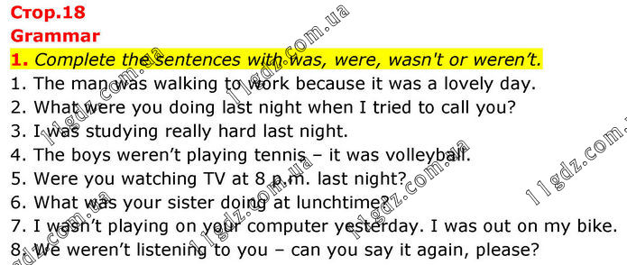 Grammar 1. Complete the sentences with was, were, wasn't or weren’t. 1. The man was walking to work because it was a lovely day. 2. What were you doing last night when I tried to call you? 3. I was studying really hard last night. 4. The boys weren’t playing tennis – it was volleyball. 5. Were you watching TV at 8 p.m. last night? 6. What was your sister doing at lunchtime? 7. I wasn’t playing on your computer yesterday. I was out on my bike. 8. We weren’t listening to you – can you say it again, please?
