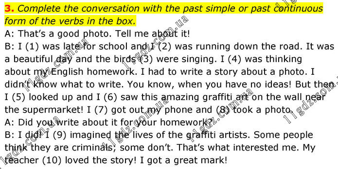 3. Complete the conversation with the past simple or past continuous form of the verbs in the box. A: That’s a good photo. Tell me about it! B: I (1) was late for school and I (2) was running down the road. It was a beautiful day and the birds (3) were singing. I (4) was thinking about my English homework. I had to write a story about a photo. I didn’t know what to write. You know, when you have no ideas! But then I (5) looked up and I (6) saw this amazing graffiti art on the wall near the supermarket! I (7) got out my phone and (8) took a photo. A: Did you write about it for your homework? B: I did! I (9) imagined the lives of the graffiti artists. Some people think they are criminals; some don’t. That’s what interested me. My teacher (10) loved the story! I got a great mark!