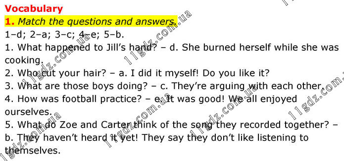 Vocabulary 1. Match the questions and answers. 1–d; 2–a; 3–c; 4–e; 5–b. 1. What happened to Jill’s hand? – d. She burned herself while she was cooking. 2. Who cut your hair? – a. I did it myself! Do you like it? 3. What are those boys doing? – c. They’re arguing with each other. 4. How was football practice? – e. It was good! We all enjoyed ourselves. 5. What do Zoe and Carter think of the song they recorded together? – b. They haven’t heard it yet! They say they don’t like listening to themselves.