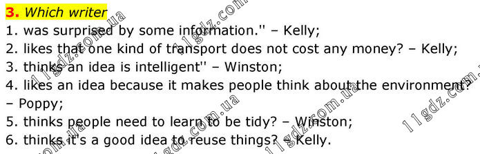 3. Which writer 1. was surprised by some information.'' – Kelly; 2. likes that one kind of transport does not cost any money? – Kelly; 3. thinks an idea is intelligent'' – Winston; 4. likes an idea because it makes people think about the environment? – Poppy; 5. thinks people need to learn to be tidy? – Winston; 6. thinks it's a good idea to reuse things? – Kelly.