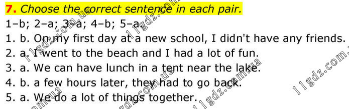 7. Choose the correct sentence in each pair. 1–b; 2–a; 3–a; 4–b; 5–a. 1. b. On my first day at a new school, I didn't have any friends. 2. a. I went to the beach and I had a lot of fun. 3. a. We can have lunch in a tent near the lake. 4. b. a few hours later, they had to go back. 5. a. We do a lot of things together.