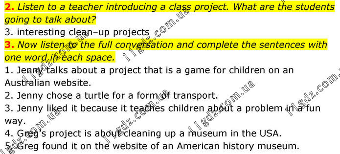 2. Listen to a teacher introducing a class project. What are the students going to talk about? 3. interesting clean–up projects 3. Now listen to the full conversation and complete the sentences with one word in each space. 1. Jenny talks about a project that is a game for children on an Australian website. 2. Jenny chose a turtle for a form of transport. 3. Jenny liked it because it teaches children about a problem in a fun way. 4. Greg’s project is about cleaning up a museum in the USA. 5. Greg found it on the website of an American history museum.