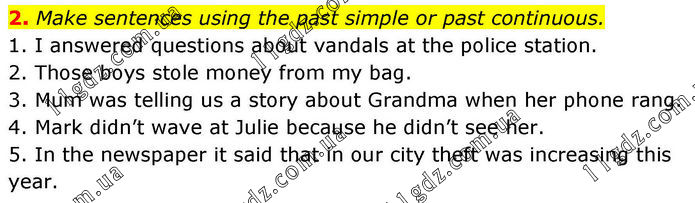 2. Make sentences using the past simple or past continuous. 1. I answered questions about vandals at the police station. 2. Those boys stole money from my bag. 3. Mum was telling us a story about Grandma when her phone rang. 4. Mark didn’t wave at Julie because he didn’t see her. 5. In the newspaper it said that in our city theft was increasing this year.