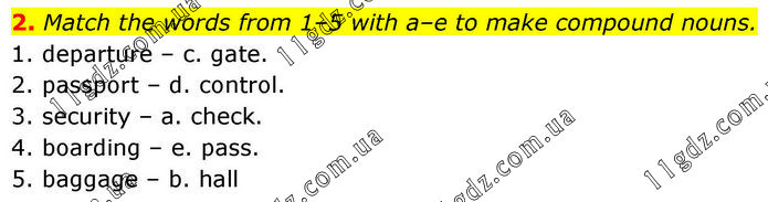 2. Match the words from 1–5 with a–e to make compound nouns. 1. departure – c. gate. 2. passport – d. control. 3. security – a. check. 4. boarding – e. pass. 5. baggage – b. hall.