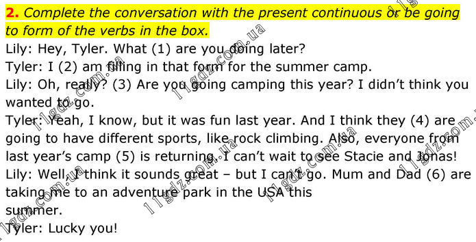 2. Complete the conversation with the present continuous or be going to form of the verbs in the box. Lily: Hey, Tyler. What (1) are you doing later? Tyler: I (2) am filling in that form for the summer camp. Lily: Oh, really? (3) Are you going camping this year? I didn’t think you wanted to go. Tyler: Yeah, I know, but it was fun last year. And I think they (4) are going to have different sports, like rock climbing. Also, everyone from last year’s camp (5) is returning. I can’t wait to see Stacie and Jonas! Lily: Well, I think it sounds great – but I can’t go. Mum and Dad (6) are taking me to an adventure park in the USA this summer. Tyler: Lucky you!