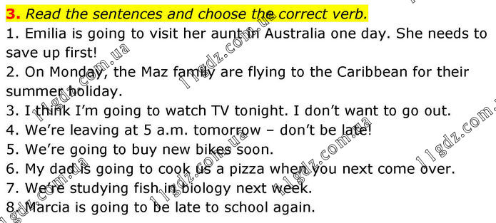 3. Read the sentences and choose the correct verb. 1. Emilia is going to visit her aunt in Australia one day. She needs to save up first! 2. On Monday, the Maz family are flying to the Caribbean for their summer holiday. 3. I think I’m going to watch TV tonight. I don’t want to go out. 4. We’re leaving at 5 a.m. tomorrow – don’t be late! 5. We’re going to buy new bikes soon. 6. My dad is going to cook us a pizza when you next come over. 7. We’re studying fish in biology next week. 8. Marcia is going to be late to school again.