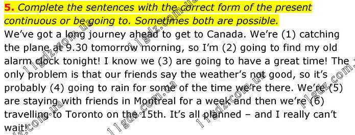 5. Complete the sentences with the correct form of the present continuous or be going to. Sometimes both are possible. We’ve got a long journey ahead to get to Canada. We’re (1) catching the plane at 9.30 tomorrow morning, so I’m (2) going to find my old alarm clock tonight! I know we (3) are going to have a great time! The only problem is that our friends say the weather’s not good, so it’s probably (4) going to rain for some of the time we’re there. We’re (5) are staying with friends in Montreal for a week and then we’re (6) travelling to Toronto on the 15th. It’s all planned – and I really can’t wait!