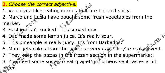 3. Choose the correct adjective. 1. Valentyna likes eating curries that are hot and spicy. 2. Marco and Lucia have bought some fresh vegetables from the market. 3. Sashimi isn’t cooked – it’s served raw. 4. Dad made some lemon juice. It’s really sour. 5. This pineapple is really juicy. It’s from Barbados. 6. Mum gets cakes from the baker’s every day. They’re really sweet. 7. They keep the pizzas in the frozen section in the supermarket. 8. You need some sugar to eat grapefruit, otherwise it tastes a bit bitter.