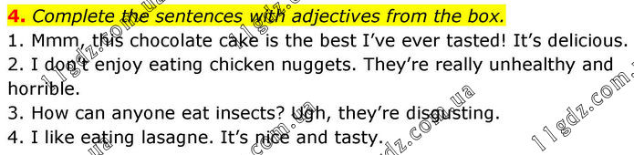 4. Complete the sentences with adjectives from the box. 1. Mmm, this chocolate cake is the best I’ve ever tasted! It’s delicious. 2. I don’t enjoy eating chicken nuggets. They’re really unhealthy and horrible. 3. How can anyone eat insects? Ugh, they’re disgusting. 4. I like eating lasagne. It’s nice and tasty.