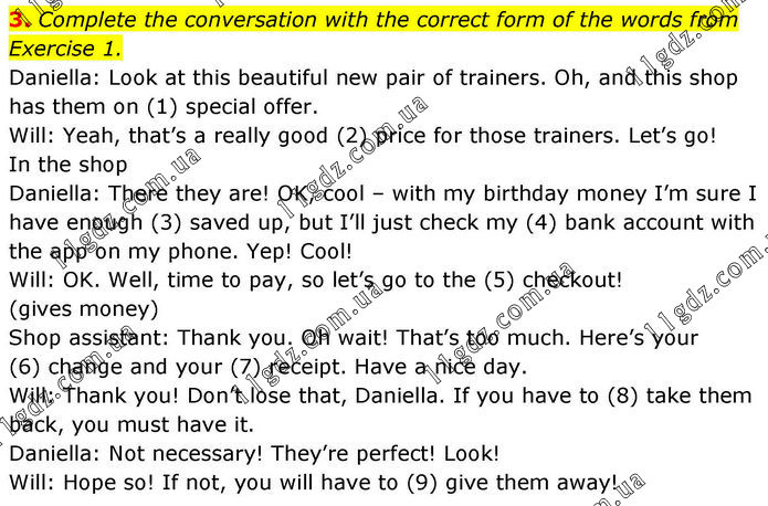 3. Complete the conversation with the correct form of the words from Exercise 1. Daniella: Look at this beautiful new pair of trainers. Oh, and this shop has them on (1) special offer. Will: Yeah, that’s a really good (2) price for those trainers. Let’s go! In the shop Daniella: There they are! OK, cool – with my birthday money I’m sure I have enough (3) saved up, but I’ll just check my (4) bank account with the app on my phone. Yep! Cool! Will: OK. Well, time to pay, so let’s go to the (5) checkout! (gives money) Shop assistant: Thank you. Oh wait! That’s too much. Here’s your (6) change and your (7) receipt. Have a nice day. Will: Thank you! Don’t lose that, Daniella. If you have to (8) take them back, you must have it. Daniella: Not necessary! They’re perfect! Look! Will: Hope so! If not, you will have to (9) give them away!