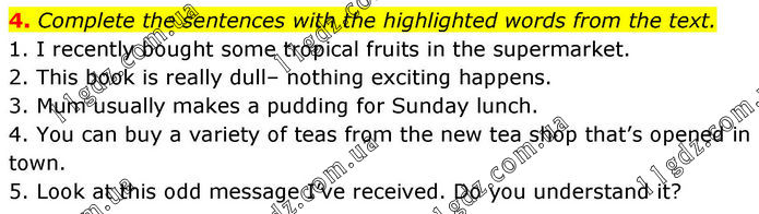 4. Complete the sentences with the highlighted words from the text. 1. I recently bought some tropical fruits in the supermarket. 2. This book is really dull– nothing exciting happens. 3. Mum usually makes a pudding for Sunday lunch. 4. You can buy a variety of teas from the new tea shop that’s opened in town. 5. Look at this odd message I’ve received. Do you understand it?