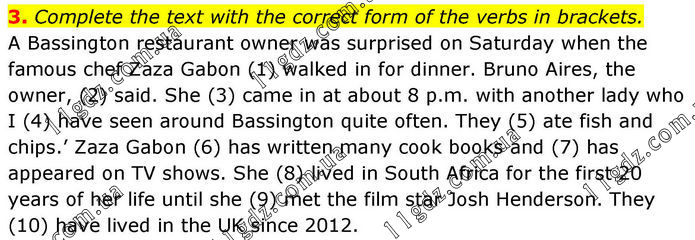 3. Complete the text with the correct form of the verbs in brackets. A Bassington restaurant owner was surprised on Saturday when the famous chef Zaza Gabon (1) walked in for dinner. Bruno Aires, the owner, (2) said. She (3) came in at about 8 p.m. with another lady who I (4) have seen around Bassington quite often. They (5) ate fish and chips.’ Zaza Gabon (6) has written many cook books and (7) has appeared on TV shows. She (8) lived in South Africa for the first 20 years of her life until she (9) met the film star Josh Henderson. They (10) have lived in the UK since 2012.