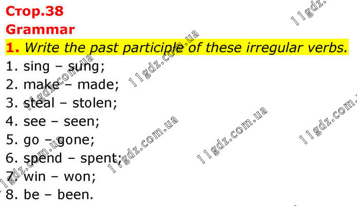 Grammar 1. Write the past participle of these irregular verbs. 1. sing – sung; 2. make – made; 3. steal – stolen; 4. see – seen; 5. go – gone; 6. spend – spent; 7. win – won; 8. be – been.