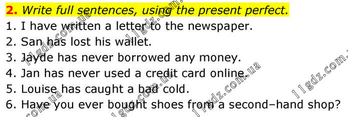 2. Write full sentences, using the present perfect. 1. I have written a letter to the newspaper. 2. San has lost his wallet. 3. Jayde has never borrowed any money. 4. Jan has never used a credit card online. 5. Louise has caught a bad cold. 6. Have you ever bought shoes from a second–hand shop?