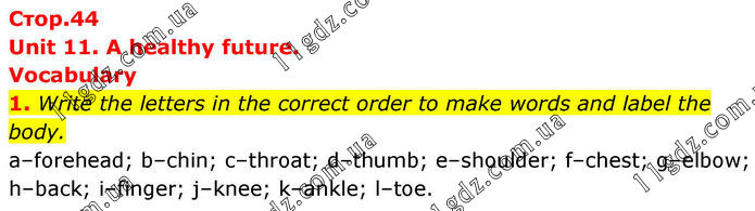 Unit 11. A healthy future. Vocabulary 1. Write the letters in the correct order to make words and label the body. a–forehead; b–chin; c–throat; d–thumb; e–shoulder; f–chest; g–elbow; h–back; i–finger; j–knee; k–ankle; l–toe.