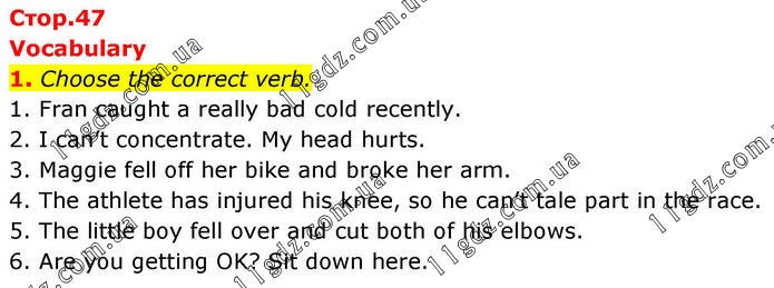 Vocabulary 1. Choose the correct verb. 1. Fran caught a really bad cold recently. 2. I can’t concentrate. My head hurts. 3. Maggie fell off her bike and broke her arm. 4. The athlete has injured his knee, so he can’t tale part in the race. 5. The little boy fell over and cut both of his elbows. 6. Are you getting OK? Sit down here.