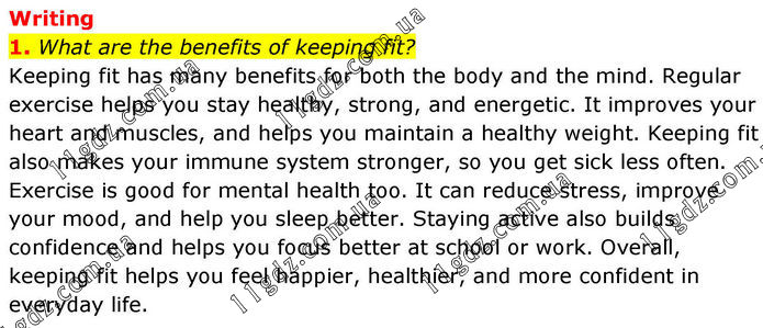 Writing 1. What are the benefits of keeping fit? Keeping fit has many benefits for both the body and the mind. Regular exercise helps you stay healthy, strong, and energetic. It improves your heart and muscles, and helps you maintain a healthy weight. Keeping fit also makes your immune system stronger, so you get sick less often. Exercise is good for mental health too. It can reduce stress, improve your mood, and help you sleep better. Staying active also builds confidence and helps you focus better at school or work. Overall, keeping fit helps you feel happier, healthier, and more confident in everyday life.