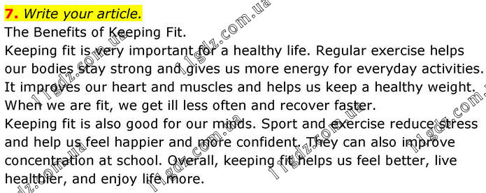 7. Write your article. The Benefits of Keeping Fit. Keeping fit is very important for a healthy life. Regular exercise helps our bodies stay strong and gives us more energy for everyday activities. It improves our heart and muscles and helps us keep a healthy weight. When we are fit, we get ill less often and recover faster. Keeping fit is also good for our minds. Sport and exercise reduce stress and help us feel happier and more confident. They can also improve concentration at school. Overall, keeping fit helps us feel better, live healthier, and enjoy life more.