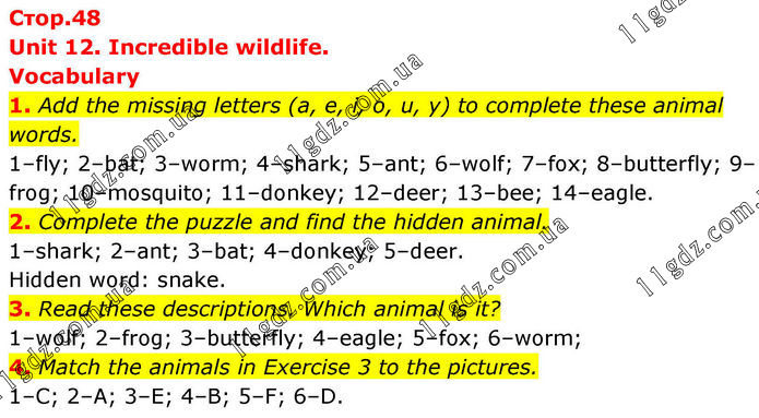 Unit 12. Incredible wildlife. Vocabulary 1. Add the missing letters (a, e, i, o, u, y) to complete these animal words. 1–fly; 2–bat; 3–worm; 4–shark; 5–ant; 6–wolf; 7–fox; 8–butterfly; 9–frog; 10–mosquito; 11–donkey; 12–deer; 13–bee; 14–eagle. 2. Complete the puzzle and find the hidden animal. 1–shark; 2–ant; 3–bat; 4–donkey; 5–deer. Hidden word: snake. 3. Read these descriptions. Which animal is it? 1–wolf; 2–frog; 3–butterfly; 4–eagle; 5–fox; 6–worm; 4. Match the animals in Exercise 3 to the pictures. 1–C; 2–A; 3–E; 4–B; 5–F; 6–D.