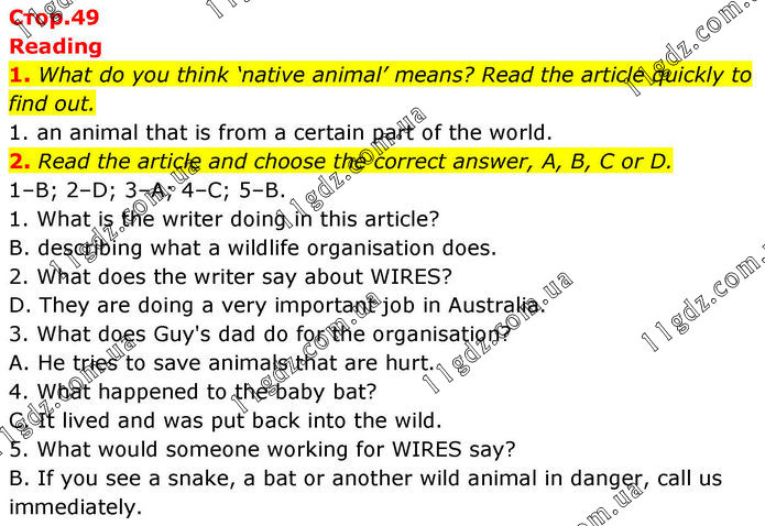 Reading 1. What do you think ‘native animal’ means? Read the article quickly to find out. 1. an animal that is from a certain part of the world. 2. Read the article and choose the correct answer, A, B, C or D. 1–B; 2–D; 3–A; 4–C; 5–B. 1. What is the writer doing in this article? B. describing what a wildlife organisation does. 2. What does the writer say about WIRES? D. They are doing a very important job in Australia. 3. What does Guy's dad do for the organisation? A. He tries to save animals that are hurt. 4. What happened to the baby bat? C. It lived and was put back into the wild. 5. What would someone working for WIRES say? B. If you see a snake, a bat or another wild animal in danger, call us immediately.
