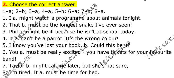 2. Choose the correct answer. 1–a; 2–b; 3–a; 4–a; 5–b; 6–a; 7–b; 8–a. 1. I a. might watch a programme about animals tonight. 2. That b. must be the longest snake I’ve ever seen! 3. Phil a. might be ill because he isn’t at school today. 4. It a. can’t be a parrot. It’s the wrong colour! 5. I know you’ve lost your book. b. Could this be it? 6. You a. must be really excited - you have tickets for your favourite band! 7. Taylor b. might call me later, but she’s not sure, 8. I’m tired. It a. must be time for bed.