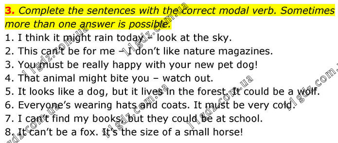 3. Complete the sentences with the correct modal verb. Sometimes more than one answer is possible. 1. I think it might rain today – look at the sky. 2. This can’t be for me – I don’t like nature magazines. 3. You must be really happy with your new pet dog! 4. That animal might bite you – watch out. 5. It looks like a dog, but it lives in the forest. It could be a wolf. 6. Everyone’s wearing hats and coats. It must be very cold. 7. I can’t find my books, but they could be at school. 8. It can’t be a fox. It’s the size of a small horse!