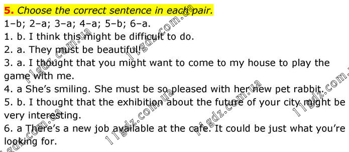 5. Choose the correct sentence in each pair. 1–b; 2–a; 3–a; 4–a; 5–b; 6–a. 1. b. I think this might be difficult to do. 2. a. They must be beautiful! 3. a. I thought that you might want to come to my house to play the game with me. 4. a She’s smiling. She must be so pleased with her new pet rabbit. 5. b. I thought that the exhibition about the future of your city might be very interesting. 6. a There’s a new job available at the cafe. It could be just what you’re looking for.