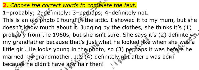 2. Choose the correct words to complete the text. 1–probably; 2–definitely; 3–perhaps; 4–definitely not. This is an old photo I found in the attic. I showed it to my mum, but she doesn’t know much about it. Judging by the clothes, she thinks it’s (1) probably from the 1960s, but she isn't sure. She says it’s (2) definitely my grandfather because that’s just what he looked like when she was a little girl. He looks young in the photo, so (3) perhaps it was before he married my grandmother. It’s (4) definitely not after I was born because he didn’t have any hair then!