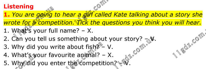 Listening 1. You are going to hear a girl called Kate talking about a story she wrote for a competition. Tick the questions you think you will hear. 1. What’s your full name? – X. 2. Can you tell us something about your story? – V. 3. Why did you write about fish? – V. 4. What’s your favourite animal? – X. 5. Why did you enter the competition? – V.