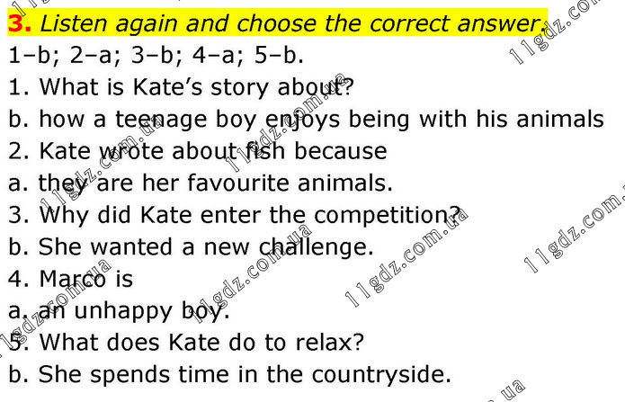 3. Listen again and choose the correct answer. 1–b; 2–a; 3–b; 4–a; 5–b. 1. What is Kate’s story about? b. how a teenage boy enjoys being with his animals 2. Kate wrote about fish because a. they are her favourite animals. 3. Why did Kate enter the competition? b. She wanted a new challenge. 4. Marco is a. an unhappy boy. 5. What does Kate do to relax? b. She spends time in the countryside.