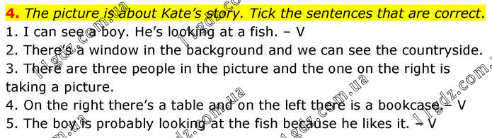 4. The picture is about Kate’s story. Tick the sentences that are correct. 1. I can see a boy. He’s looking at a fish. – V 2. There’s a window in the background and we can see the countryside. 3. There are three people in the picture and the one on the right is taking a picture. 4. On the right there’s a table and on the left there is a bookcase. – V 5. The boy is probably looking at the fish because he likes it. – V