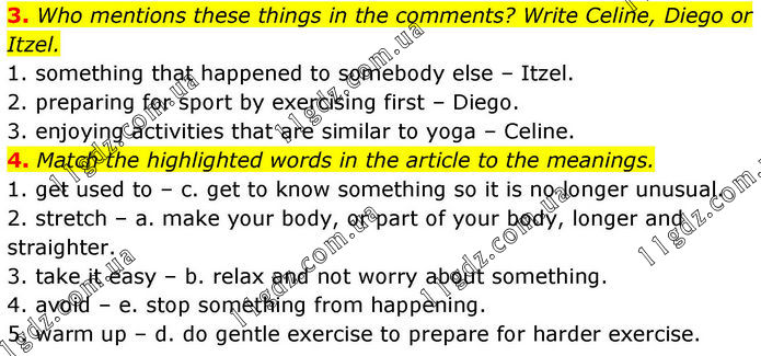 3. Who mentions these things in the comments? Write Celine, Diego or Itzel. 1. something that happened to somebody else – Itzel. 2. preparing for sport by exercising first – Diego. 3. enjoying activities that are similar to yoga – Celine. 4. Match the highlighted words in the article to the meanings. 1. get used to – c. get to know something so it is no longer unusual. 2. stretch – a. make your body, or part of your body, longer and straighter. 3. take it easy – b. relax and not worry about something. 4. avoid – e. stop something from happening. 5. warm up – d. do gentle exercise to prepare for harder exercise.