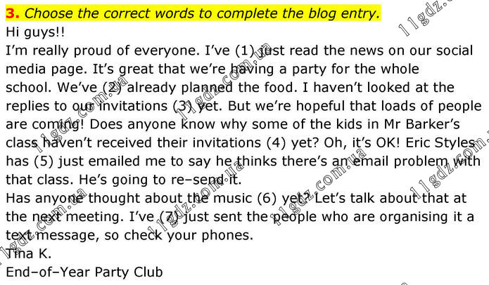 3. Choose the correct words to complete the blog entry. Hi guys!! I’m really proud of everyone. I’ve (1) just read the news on our social media page. It’s great that we’re having a party for the whole school. We’ve (2) already planned the food. I haven’t looked at the replies to our invitations (3) yet. But we’re hopeful that loads of people are coming! Does anyone know why some of the kids in Mr Barker’s class haven’t received their invitations (4) yet? Oh, it’s OK! Eric Styles has (5) just emailed me to say he thinks there’s an email problem with that class. He’s going to re–send it. Has anyone thought about the music (6) yet? Let’s talk about that at the next meeting. I’ve (7) just sent the people who are organising it a text message, so check your phones. Tina K. End–of–Year Party Club