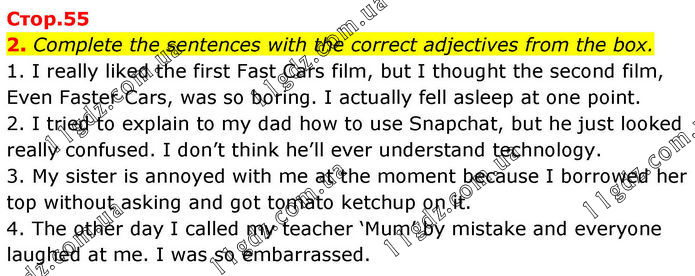 2. Сomplete the sentences with the correct adjectives from the box. 1. I really liked the first Fast Cars film, but I thought the second film, Even Faster Cars, was so boring. I actually fell asleep at one point. 2. I tried to explain to my dad how to use Snapchat, but he just looked really confused. I don’t think he’ll ever understand technology. 3. My sister is annoyed with me at the moment because I borrowed her top without asking and got tomato ketchup on it. 4. The other day I called my teacher ‘Mum’ by mistake and everyone laughed at me. I was so embarrassed.