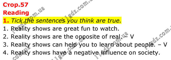 Reading 1. Tick the sentences you think are true. 1. Reality shows are great fun to watch. 2. Reality shows are the opposite of real. – V 3. Reality shows can help you to learn about people. – V 4. Reality shows have a negative influence on society.