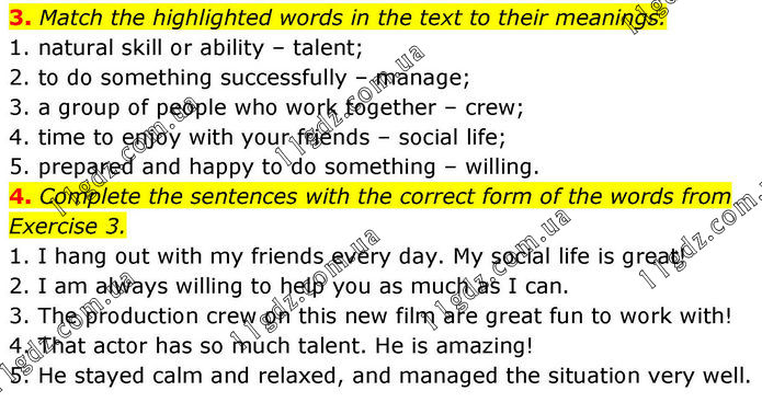 3. Match the highlighted words in the text to their meanings. 1. natural skill or ability – talent; 2. to do something successfully – manage; 3. a group of people who work together – crew; 4. time to enjoy with your friends – social life; 5. prepared and happy to do something – willing. 4. Complete the sentences with the correct form of the words from Exercise 3. 1. I hang out with my friends every day. My social life is great! 2. I am always willing to help you as much as I can. 3. The production crew on this new film are great fun to work with! 4. That actor has so much talent. He is amazing! 5. He stayed calm and relaxed, and managed the situation very well.