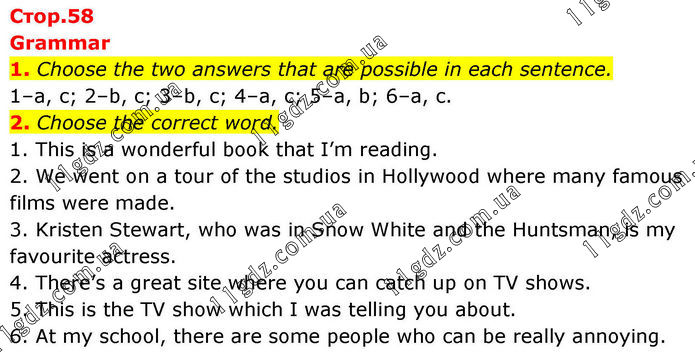 Grammar 1. Choose the two answers that are possible in each sentence. 1–a, c; 2–b, c; 3–b, c; 4–a, c; 5–a, b; 6–a, c. 2. Choose the correct word. 1. This is a wonderful book that I’m reading. 2. We went on a tour of the studios in Hollywood where many famous films were made. 3. Kristen Stewart, who was in Snow White and the Huntsman, is my favourite actress. 4. There’s a great site where you can catch up on TV shows. 5. This is the TV show which I was telling you about. 6. At my school, there are some people who can be really annoying.