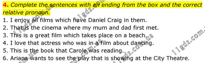 4. Complete the sentences with an ending from the box and the correct relative pronoun. 1. I enjoy all films which have Daniel Craig in them. 2. That is the cinema where my mum and dad first met. 3. This is a great film which takes place on a beach. 4. I love that actress who was in a film about dancing. 5. This is the book that Carole was reading. 6. Ariana wants to see the play that is showing at the City Theatre.