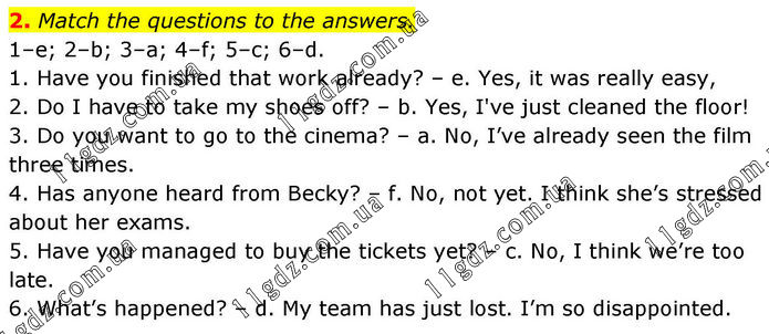 2. Match the questions to the answers. 1–e; 2–b; 3–a; 4–f; 5–c; 6–d. 1. Have you finished that work already? – e. Yes, it was really easy, 2. Do I have to take my shoes off? – b. Yes, I've just cleaned the floor! 3. Do you want to go to the cinema? – a. No, I’ve already seen the film three times. 4. Has anyone heard from Becky? – f. No, not yet. I think she’s stressed about her exams. 5. Have you managed to buy the tickets yet? – c. No, I think we’re too late. 6. What’s happened? – d. My team has just lost. I’m so disappointed.