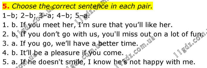 5. Choose the correct sentence in each pair. 1–b; 2–b; 3–a; 4–b; 5–a. 1. b. If you meet her, I’m sure that you’ll like her. 2. b. If you don’t go with us, you'll miss out on a lot of fun. 3. a. If you go, we’ll have a better time. 4. b. It’ll be a pleasure if you come. 5. a. If he doesn't smile, I know he’s not happy with me.