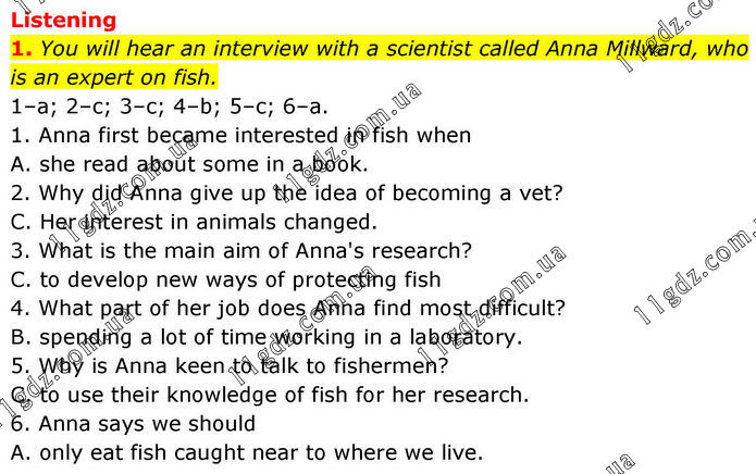 Listening 1. You will hear an interview with a scientist called Anna Millward, who is an expert on fish. 1–a; 2–c; 3–c; 4–b; 5–c; 6–a. 1. Anna first became interested in fish when A. she read about some in a book. 2. Why did Anna give up the idea of becoming a vet? C. Her interest in animals changed. 3. What is the main aim of Anna's research? C. to develop new ways of protecting fish 4. What part of her job does Anna find most difficult? B. spending a lot of time working in a laboratory. 5. Why is Anna keen to talk to fishermen? C. to use their knowledge of fish for her research. 6. Anna says we should A. only eat fish caught near to where we live.